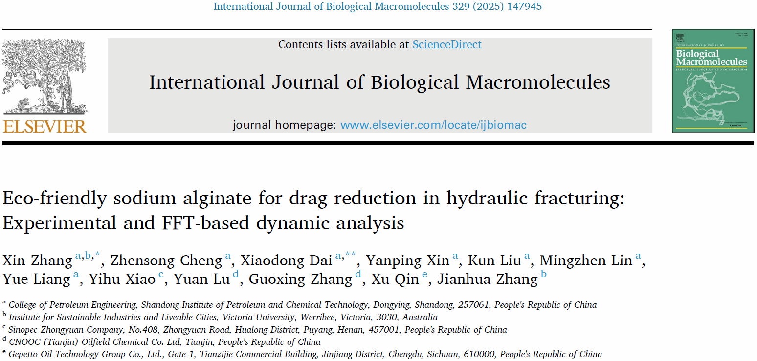近日,我院油气复杂流动保障科研团队在生物大分子领域国际权威期刊《International Journal of Biological Macromolecules》在线发表题为“Eco-friendly sodium alginate for drag reduction in hydraulic fracturing: Experimental and FFT-based dynamic analysis”的研究论文,我院为论文第一完成单位,论文第一作者为石油工程学院教师张昕。