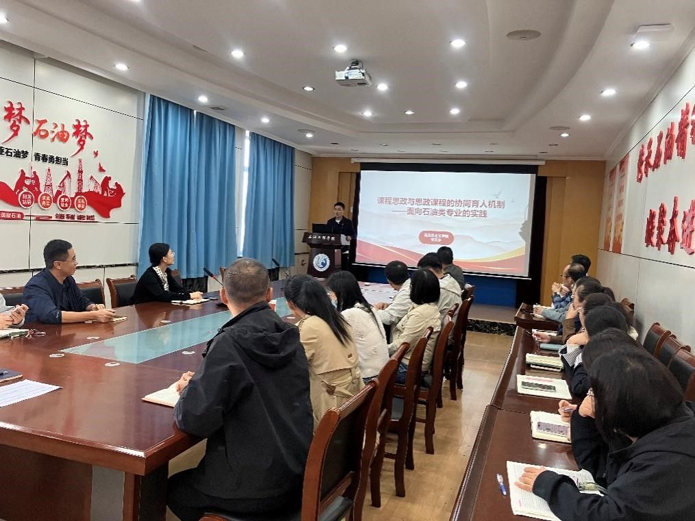 为进一步筑牢课程思想根基,探讨学院课程思政建设路径,10月14日,在2028会议室,学院特邀马克思主义学院李天宇老师作了题为《课程思政与思政课程的协同育人机制面向石油类专业的实践路径》的专题报告,并以此为契机,全院任课教师结合课程思政建设进行了深入研讨。