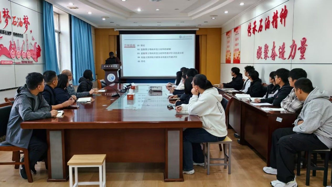 2025年10月24日下午,由石油工程学院主办的“青年学者学术沙龙”在西配楼2028会议室顺利举行。本次围绕“基于温敏聚合物纳米复合材料的无固相钻井液高温稳定特性研究”的主题,特邀TCHAMENI ALAIN PIERRE(皮尔)博士担任主讲嘉宾,特邀乔文丽、于冠群参与分享。