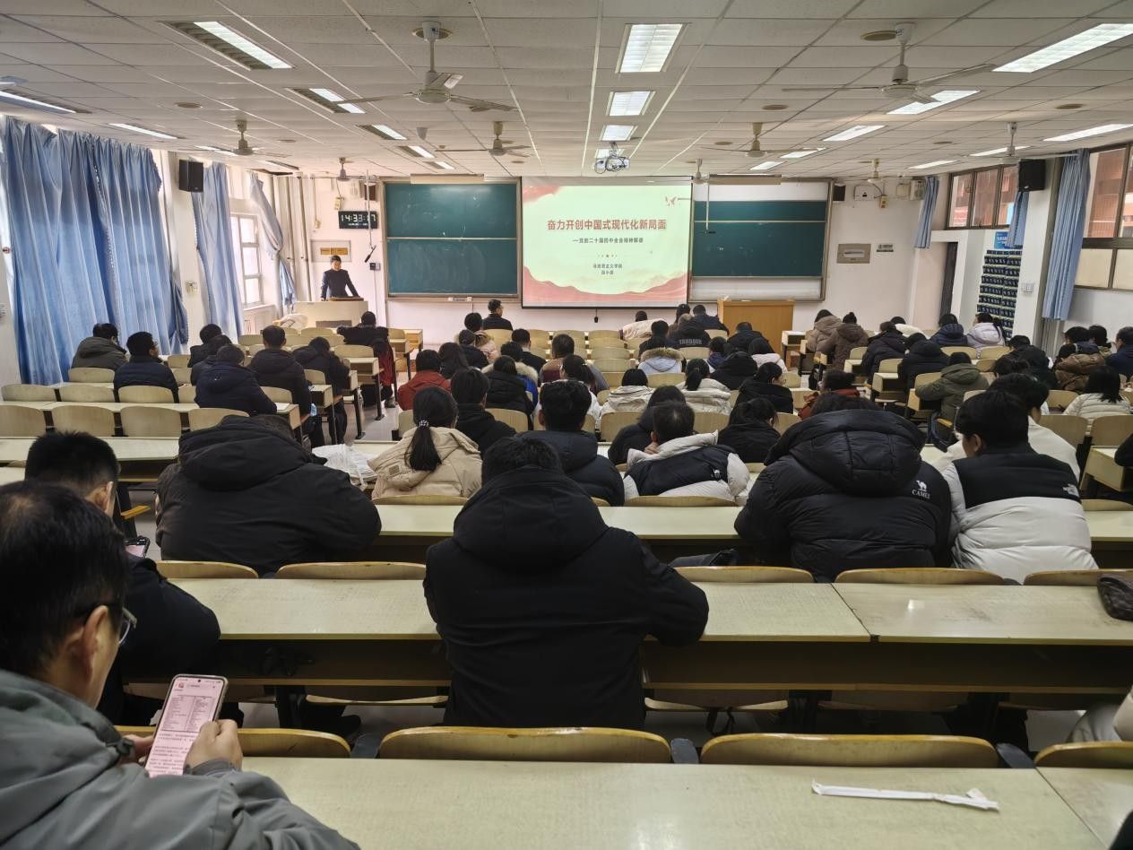 为深入学习宣传贯彻党的二十届四中全会精神,12月23日,石油工程学院在四教103教室,举办学习贯彻党的二十届四中全会精神宣讲报告会。报告会邀请学校宣讲团成员、马克思主义学院高小晨老师,以《奋力开创中国式现代化新局面》为题作专题宣讲,学院全体教职工及学生党员参加。