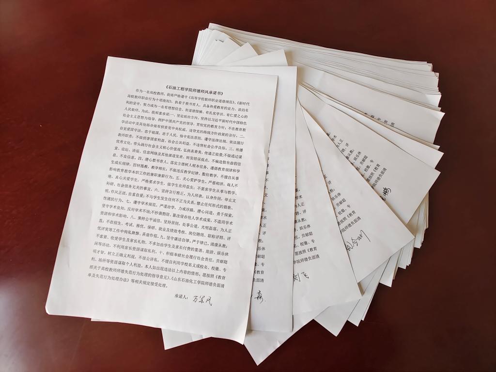 王蛟院长领誓了“师德铸魂,匠心筑梦”师德师风誓言。最后,石油工程学院全体教师签订了《石油工程学院师德师风承诺书》,郑重承诺将以更加优秀的师德师风,为培养高素质专业人才贡献力量。此次活动深入推进了教师师德师风建设,为高质量教育事业注入了更多的正能量。