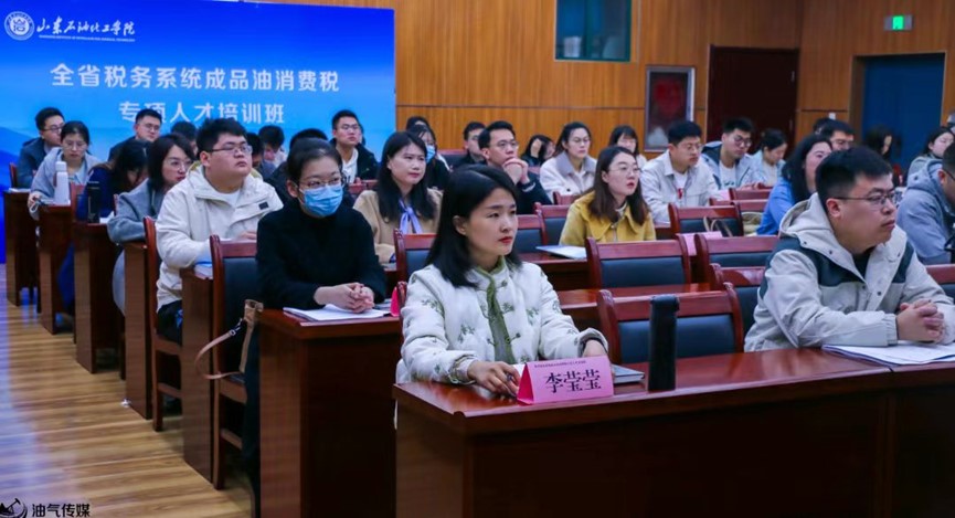 3月25日上午“全省税务系统成品油消费税专项人才培训班”开班仪式在学校图书馆报告厅顺利召开。国家税务总局山东省税务局货物和劳务税处处长许兰革、副处长王一川、东营市税务局总会计师张春雷、山东石油化工学院党政办公室(校长办公室、校友工作办公室)主任王志胜、石油工程学院院长代晓东、副院长辛艳萍等领导出席,培训班57名参训人员参加。辛艳萍主持开班仪式。