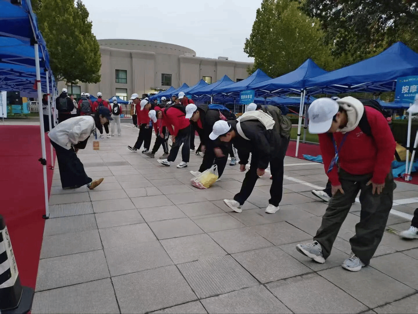 为弘扬东营双金马拉松精神,保障 2025 年黄河口(东营)马拉松圆满举行,10 月 19 日,石油工程学院选派 100 名志愿者,于东营马拉松主会场开展赛后修复志愿服务活动。赛事当日凌晨 5 时,志愿者们身着统一制服提前抵达,接受系统培训,为服务做好充分准备。