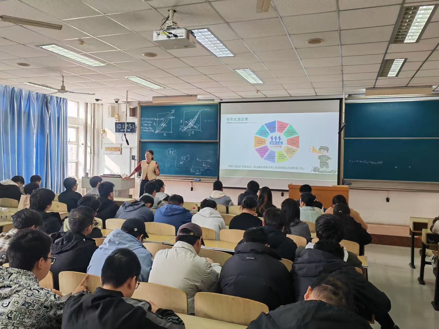 为进一步宣传国家征兵政策,鼓励青年大学生携笔从戎,投身军旅,近日我院2026年毕业生征兵、优抚安置政策咨询暨征兵政策宣讲会成功举办。宣讲由李聪聪副院长主讲,李聪聪带领各毕业年级辅导员走进各毕业班级,旨在让广大适龄青年充分了解征兵政策,提高征兵工作的知晓率和参与度。