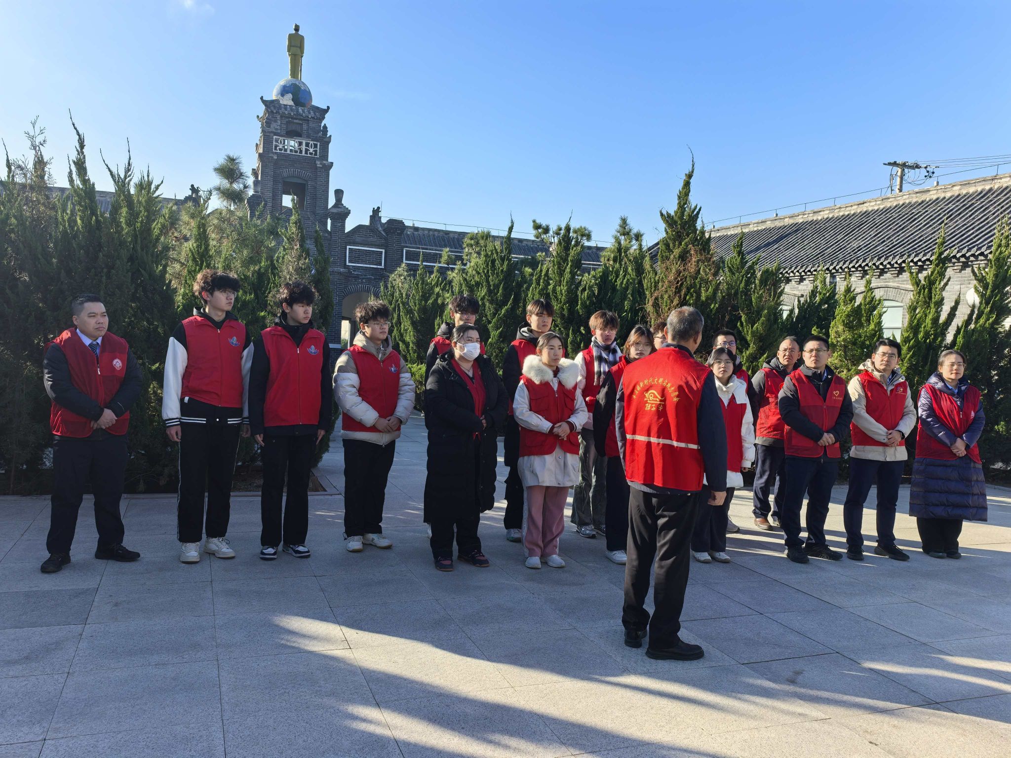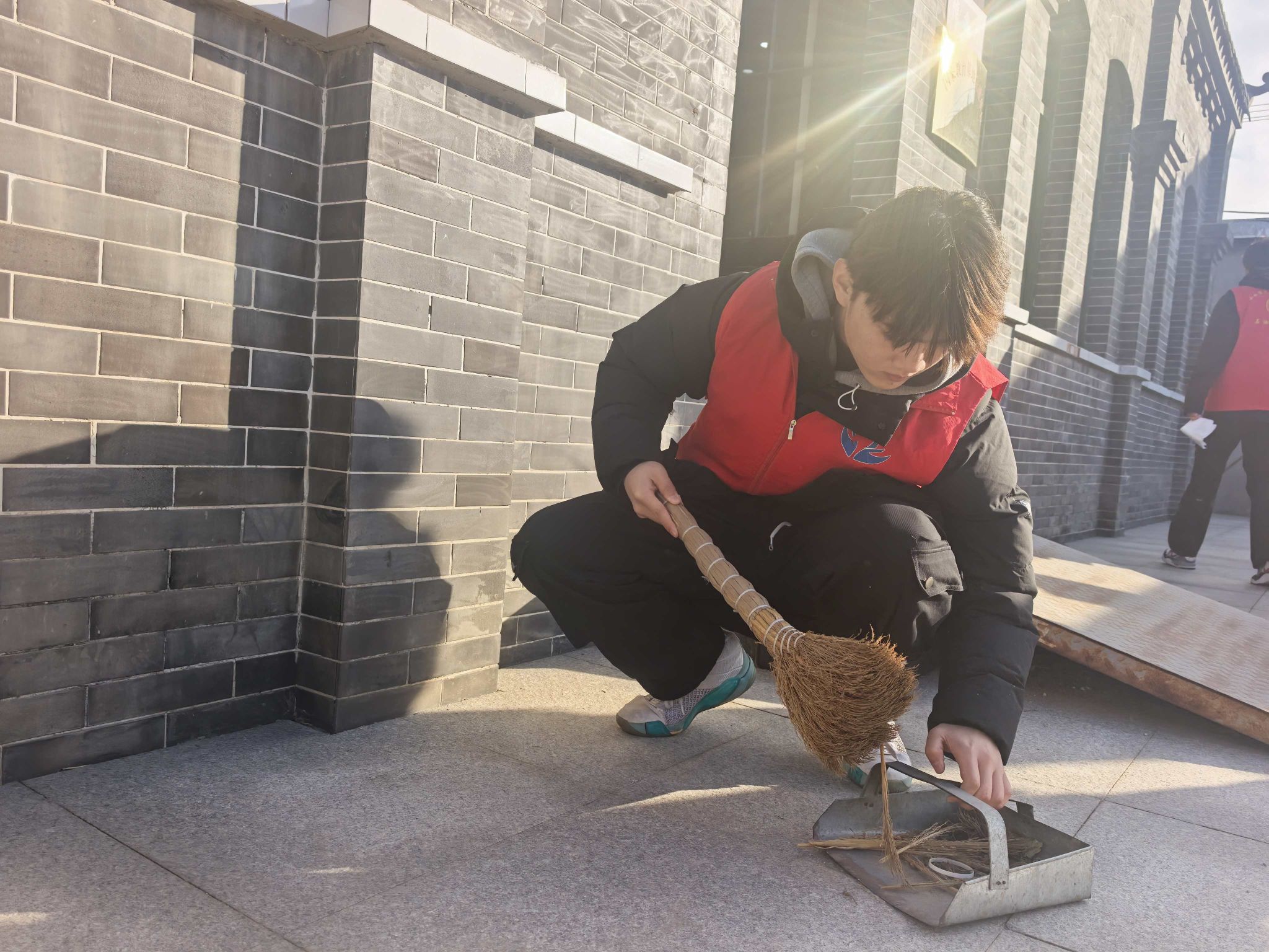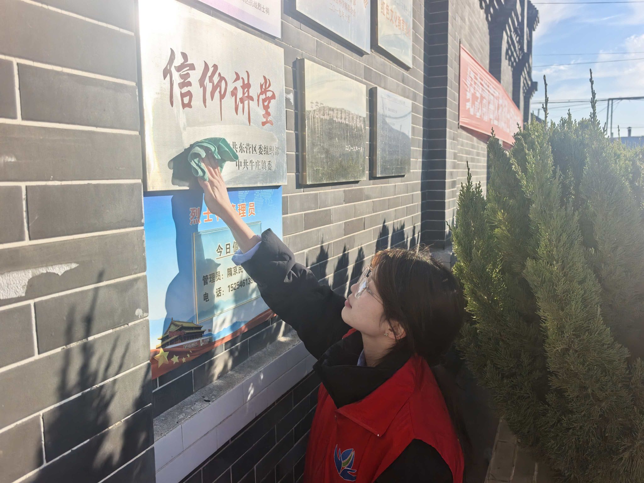 上午 9 时,怀着对革命先烈的崇敬之情,志愿者们准时集结于渤海区抗战烈士祠。活动伊始,志愿者们迅速分工、协同作战,开展卫生清扫工作,认真清理烈士祠周边的落叶残枝,细致擦拭展柜玻璃,为后续参观学习营造整洁环境,让英烈安息之地更显庄严肃穆。