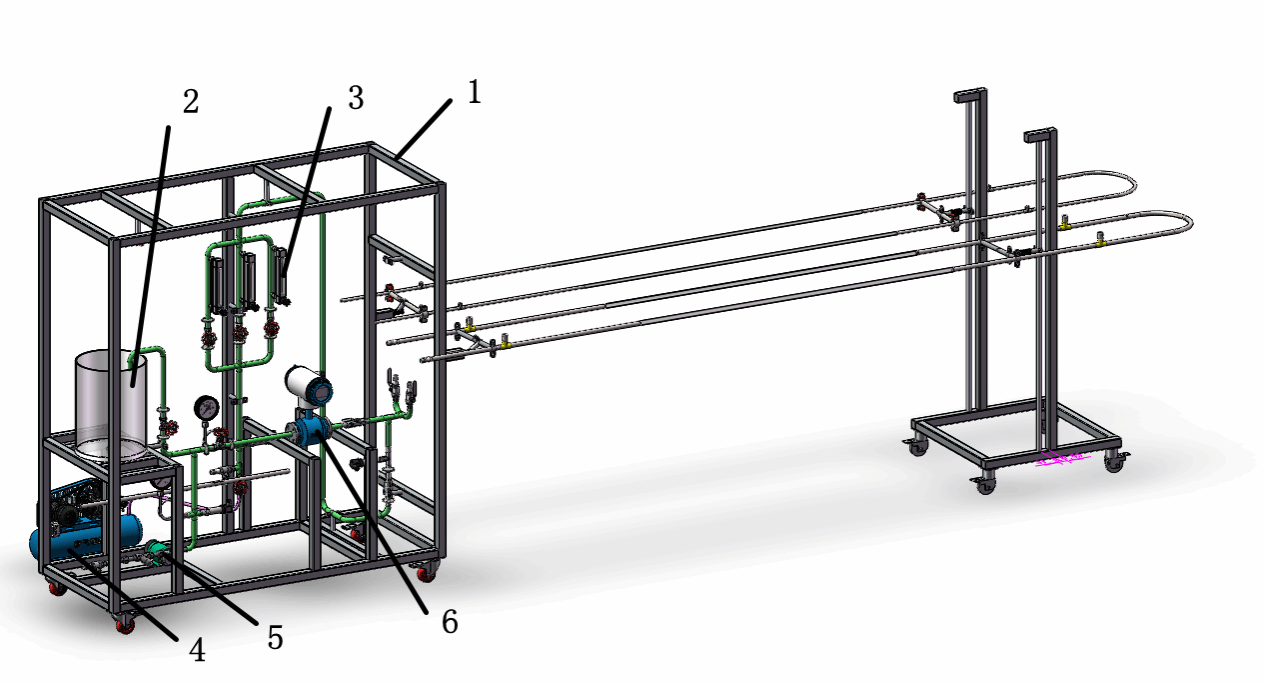 1-框架;2-水箱;3-转子流量计;4-空压机;5-水泵;6-涡轮流量计
