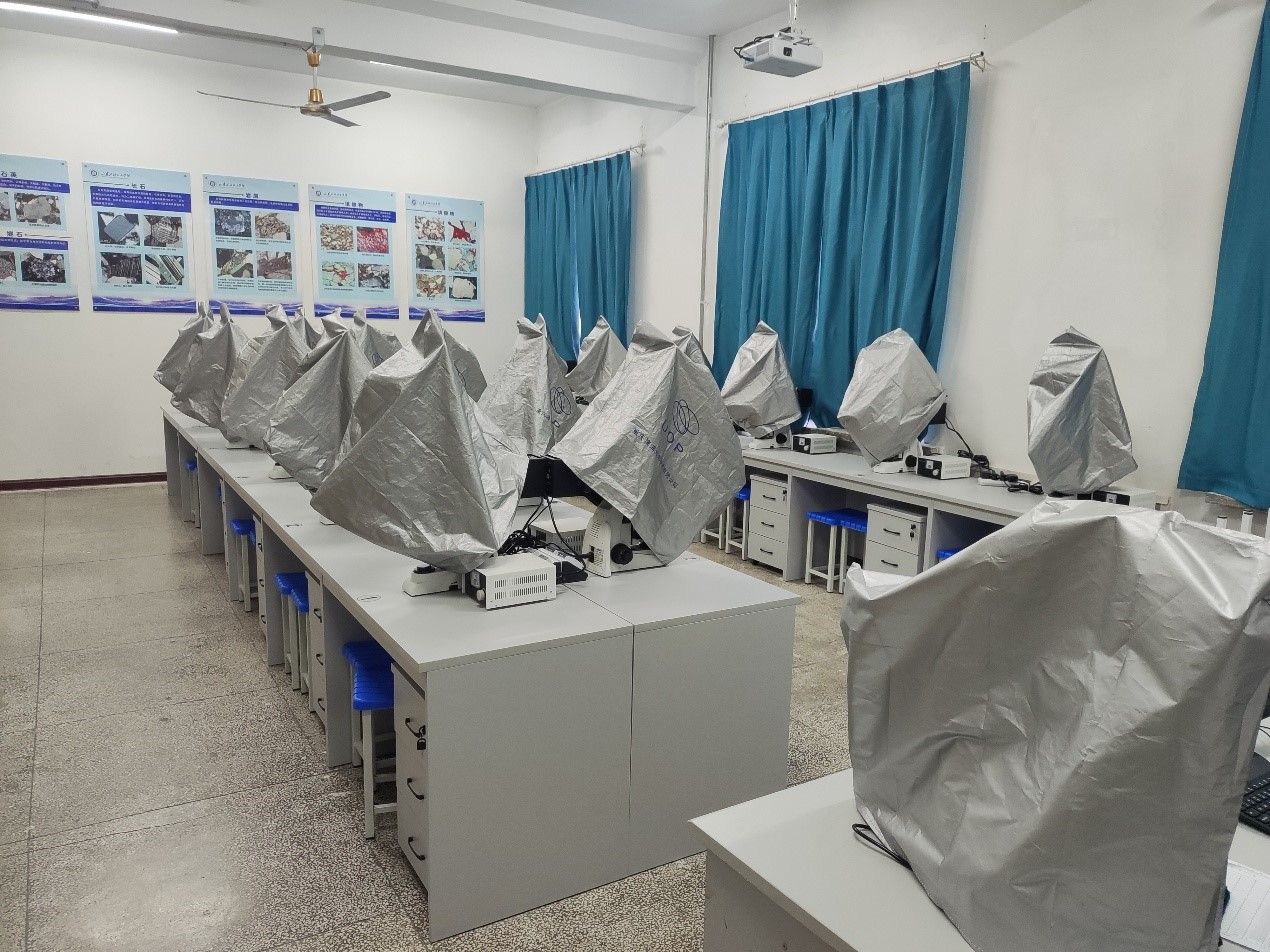 沉积学实验室配备17台偏光显微镜,是沉积学、石油地质、矿产勘探等领域不可或缺的核心实验平台,核心依托偏光显微镜的晶体光学原理,在微米尺度开展沉积岩微观特征观测与矿物鉴定工作。实验室主要通过单偏光、正交偏光等观测模式,分析岩石的物质组分、结构构造、成岩作用及微相类型,进而为物源区判断、沉积环境重建、成岩演化过程及储层物性评价提供关键微观证据。在科研方面,可精准鉴定石英、长石、方解石等透明矿物及各类重矿物,统计矿物含量、颗粒形态等参数,解析碎屑岩、碳酸盐岩的微观结构与特殊构造,识别压实、胶结、溶蚀等成岩作用类型,助力油气储层、古地理环境等相关研究。